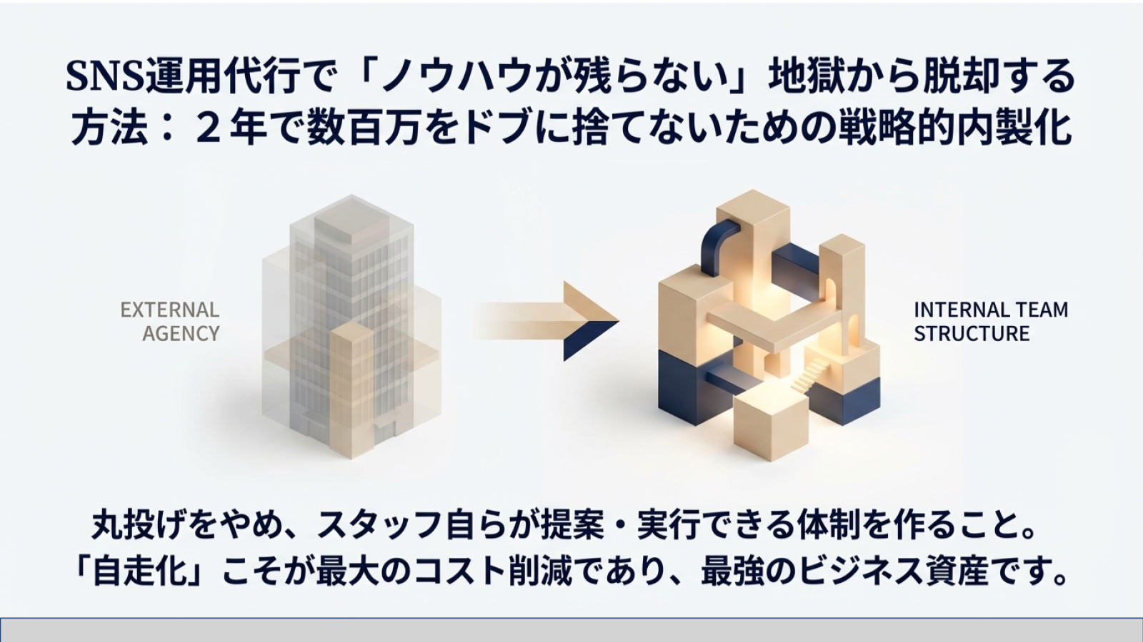 本記事では、そんな「運用代行ノウハウ残らない問題」を根本から解決する方法を解説します。代行に依存せず、自社でSNSを資産化し、スタッフ自らが「次はこういう投稿にしましょう」と提案できる体制をどう作るべきか。その具体的なロードマップを提示します。