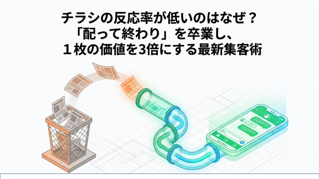 チラシの反応率が低いのは、あなたのスキルのせいではなく、時代の変化によるものです。今の消費者は、紙を見て即決するほど単純ではありません。だからこそ、「紙(認知)」と「LINE(教育・行動)」を繋ぐ設計が不可欠なのです。